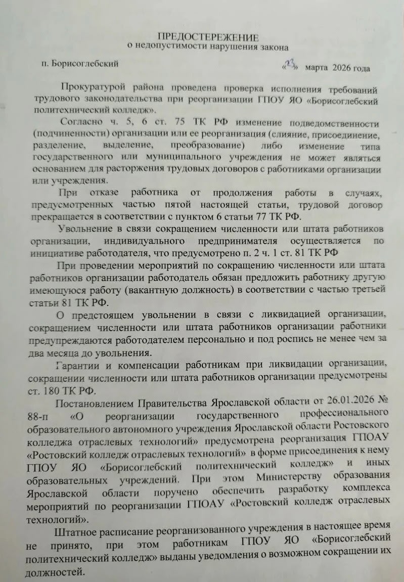 В прокуратуру обратился депутат Государственной Думы РФ, лидер ярославского отделения партии "СПРАВЕДЛИВАЯ РОССИЯ" Анатолий Грешневиков. Он просил провести проверку в "Борисоглебском политехническом колледже". Ранее было объявлено о планируемой реорганизации этого учреждения и сокращениях сотрудников в связи с этими изменениями. Депутат в своем обращении указывал на то, что сокращения работников могут нанести непоправимый вред профессиональному образованию учащихся.
